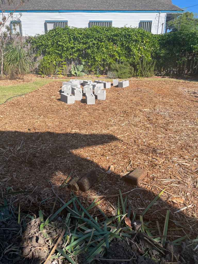 **If you don’t care about perfect aesthetics, then put the blocks on the ground and keep it moving. The food will grow whether the blocks lineup or not. The dips and gaps just give it character. I did put some effort into leveling the ground beforehand, but my mistake was building on top of a thick layer of mulch. It settled and decayed, and the ground underneath my bed shifted, causing it to look a little wonky.