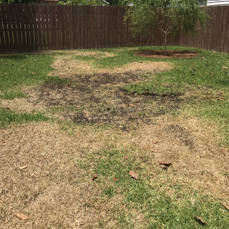 One summer we had a drought for the first half and endless storming the second half. By the end of the year, my cinderblock raised beds had shifted to the point that I had to rebuild them, and my arbor started leaning to one side where the cement footings on the right pillars sunk deeper, pulling the left ones up. Most recently, so much soil washed away in the back half of my yard that it exposed a buried cement pad I never knew was there (and didn’t want). The overall patchiness and lack of health throughout the lawn makes it a prime breeding ground for red ants, which is a nightmare for both me and the dogs.